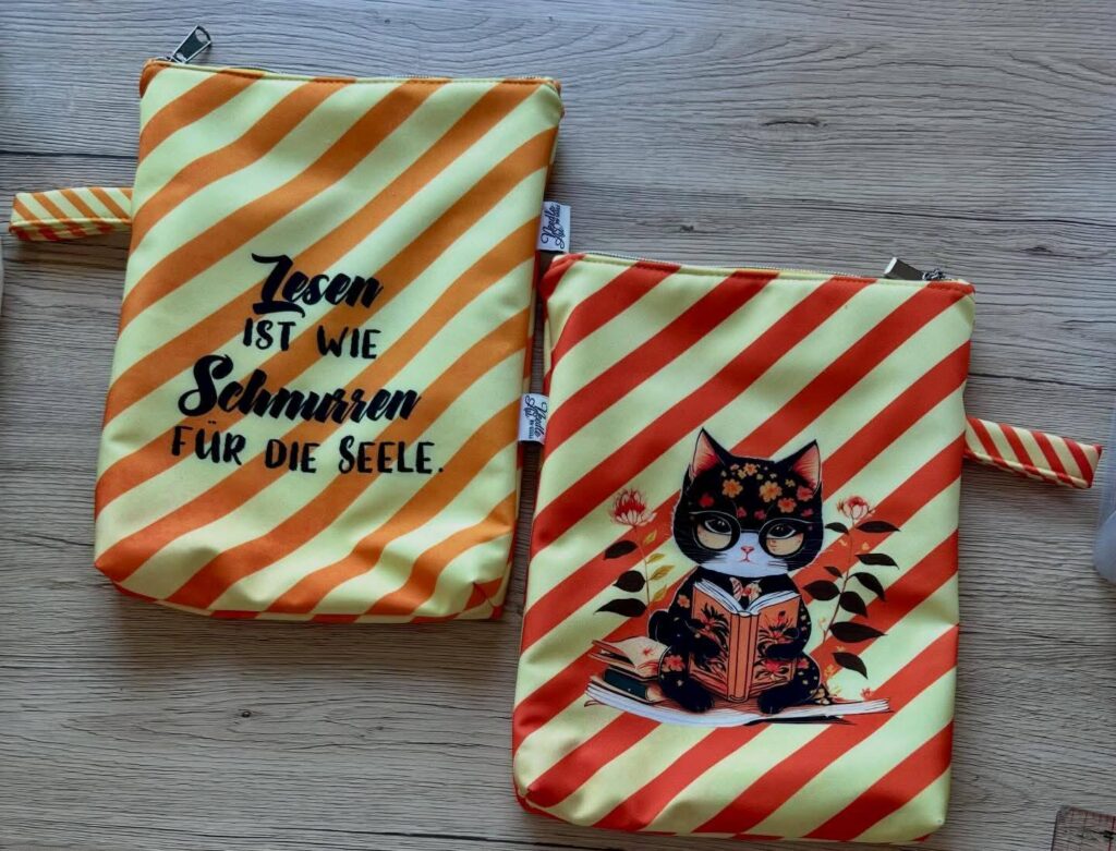 Das neueste Produkt sind Booksleeves, das sind Buchtaschen, die oben ganz einfach mit einem Druckknopf geschlossen werden.