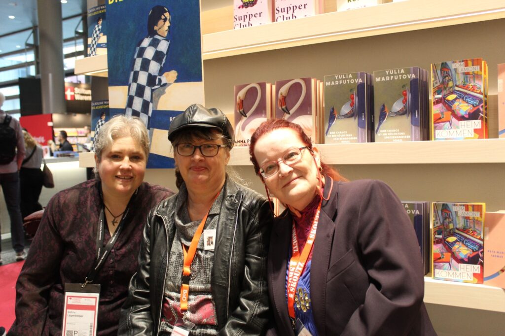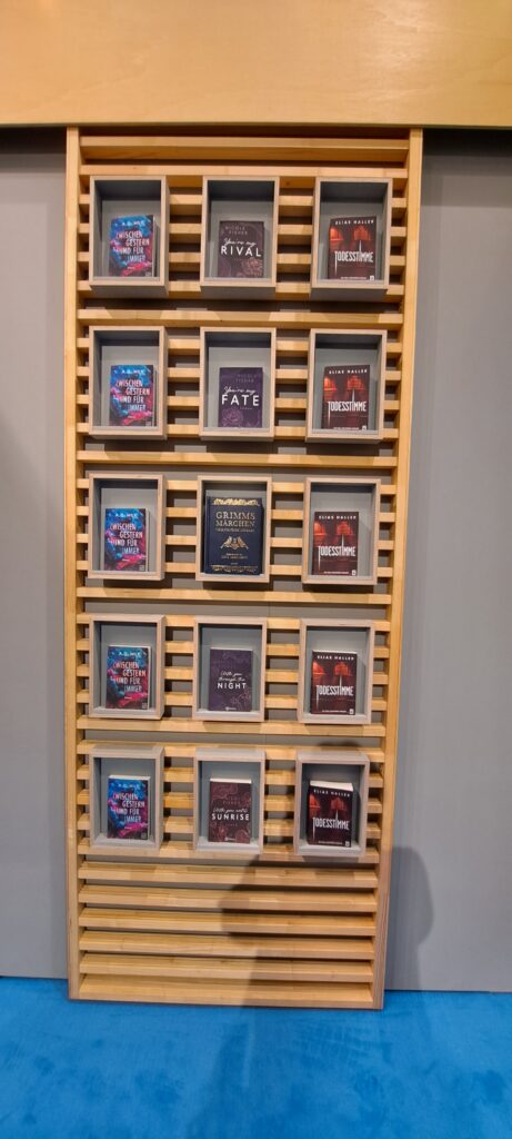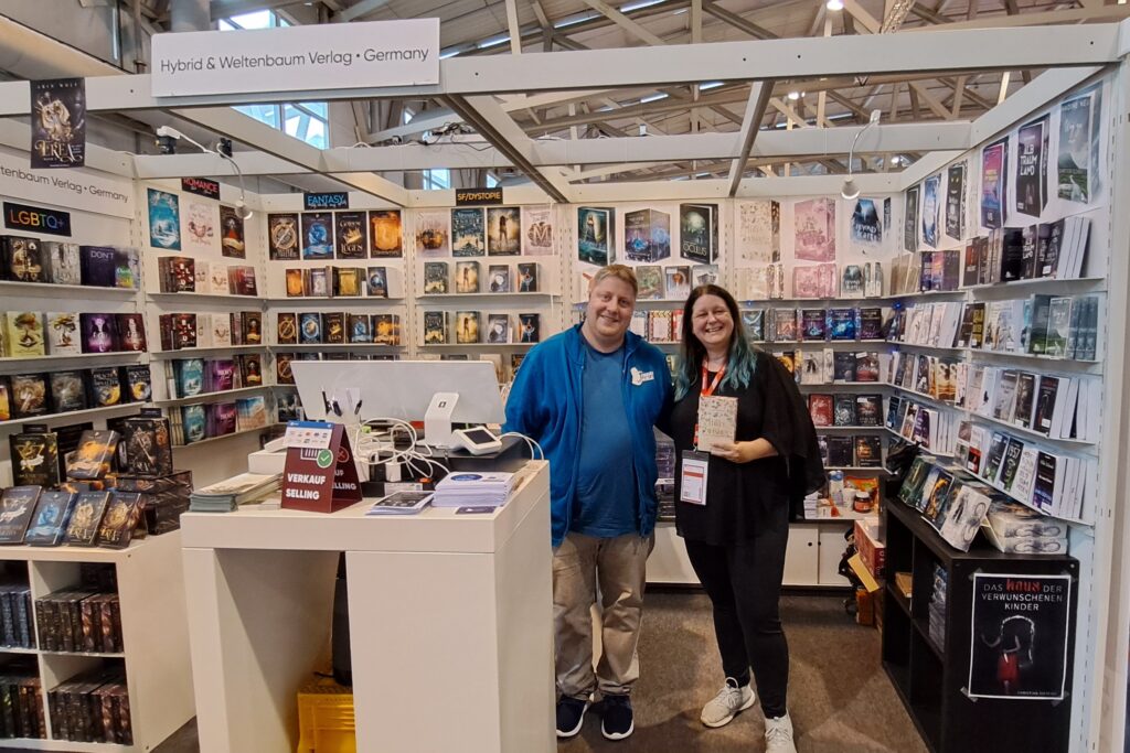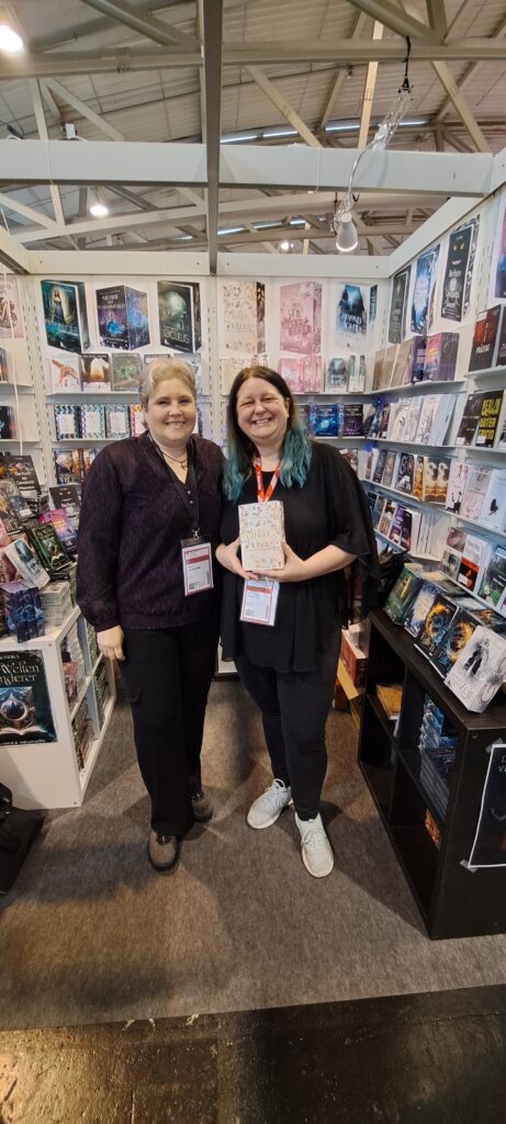 Natürlich suchte ich auch nach meiner zuckersüßen Yvonne Wundersee. Da war sie mitsamt ihrem neuen Buch „Three Wishes“. Ein Foto von dem „Hybrid & Weltenbaum Verlags-Stand und uns durfte nicht fehlen.