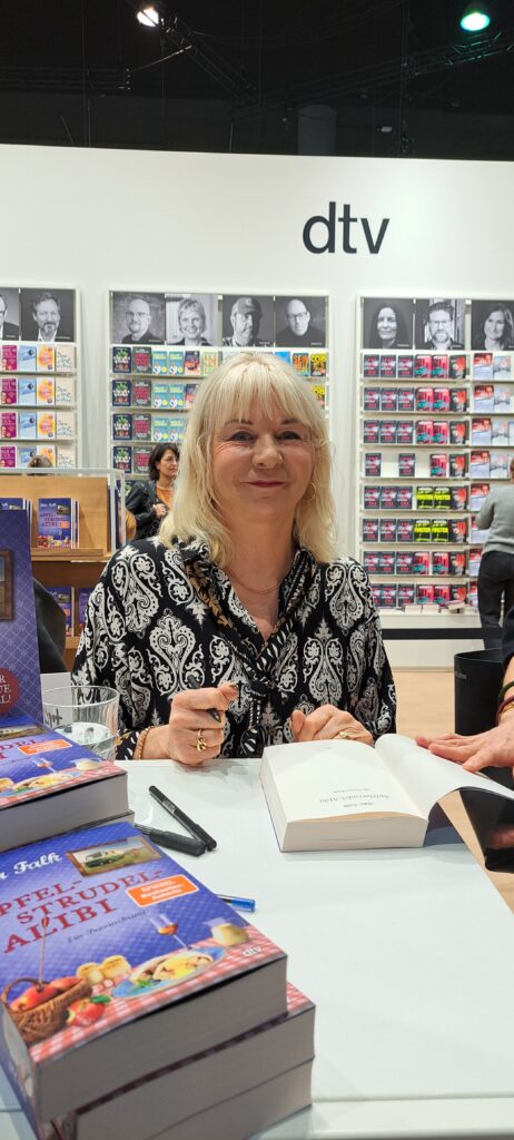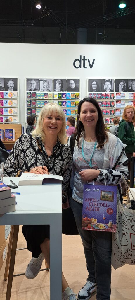 Rita Falk mit ihrem neuen Buch „Apfelstrudel Alibi“. Da stand Rebecca in der Schlange. Sie mag ihre Bücher so sehr. Wie freute ich mich für sie, das wir noch ein Bild machen konnten. Schaut wie sie strahlt.