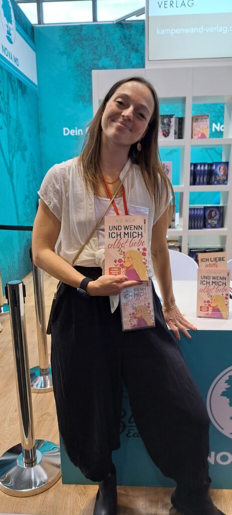 In Halle 1.2 trafen wir auf A.D. Wilk mit ihrem neuen Buch „Und wenn ich mich selbst liebe“ aus dem „Kampenwand Verlag“.