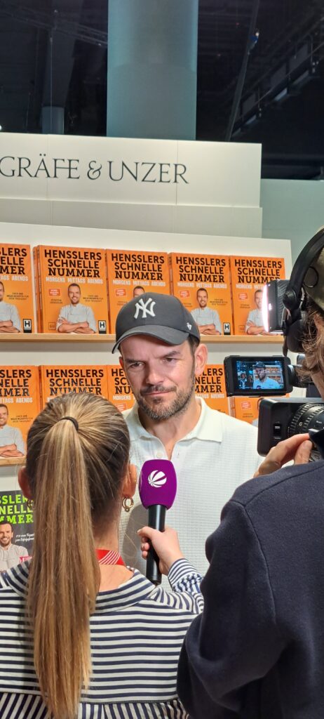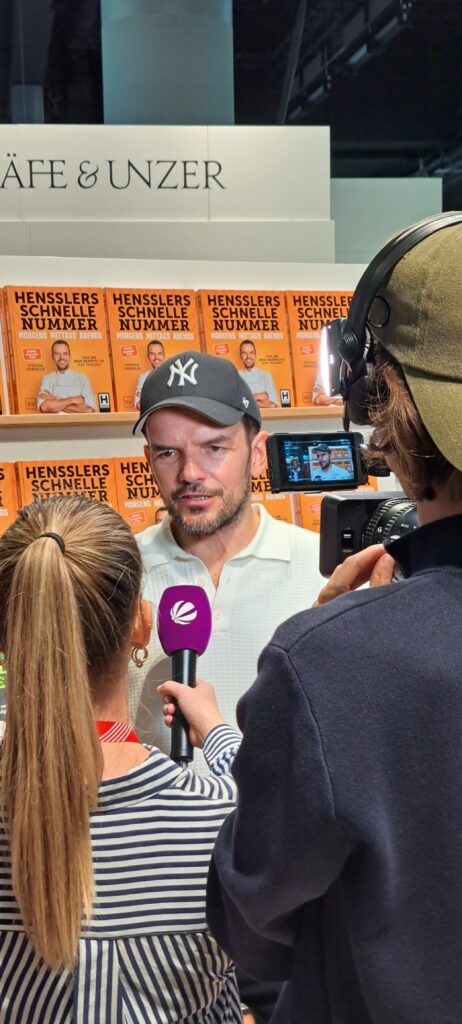 Steffen Henssler, steht Rede und Antwort dem SAT 1 Team.