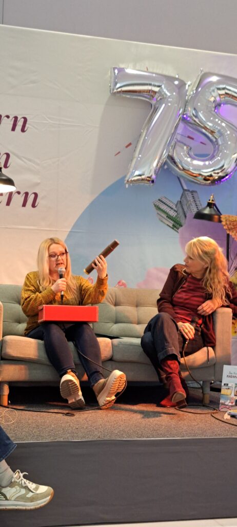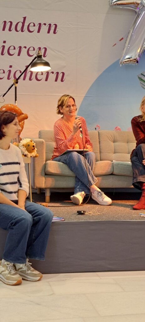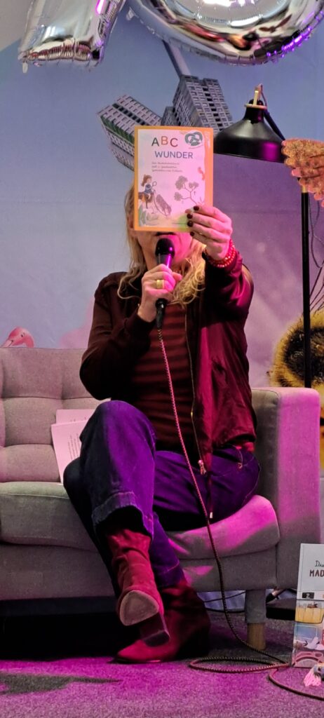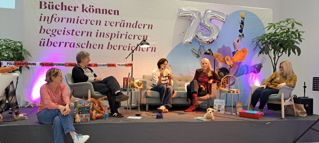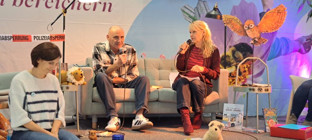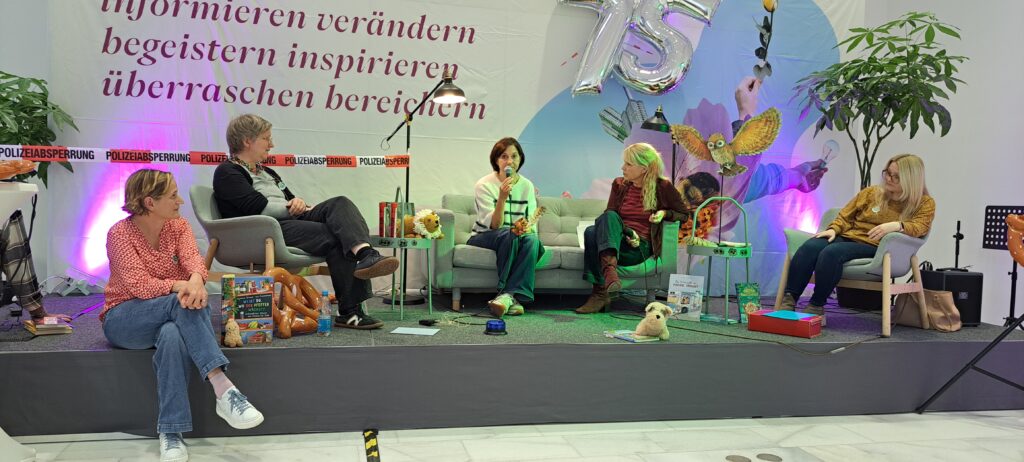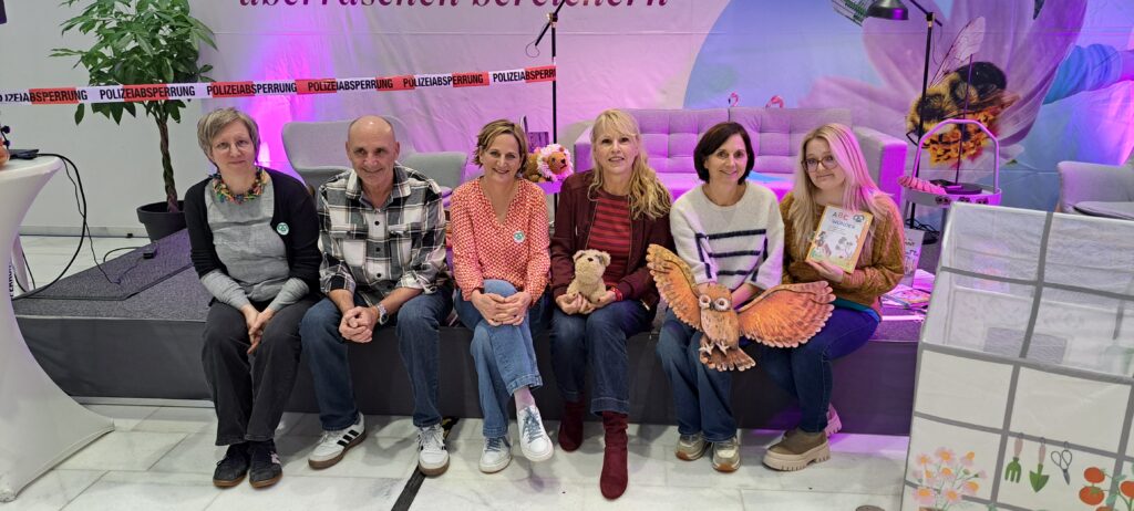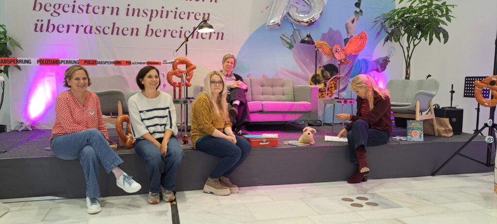 Sie möchten ihre Bekanntheit steigern. Möchten das viele Menschen von ihnen erfahren. Inzwischen sind es zwanzig Autorinnen, Autoren, Illustratorinnen und Illustratoren. Sechs sind heute da. Eine ist inkognito im Publikum. 😉