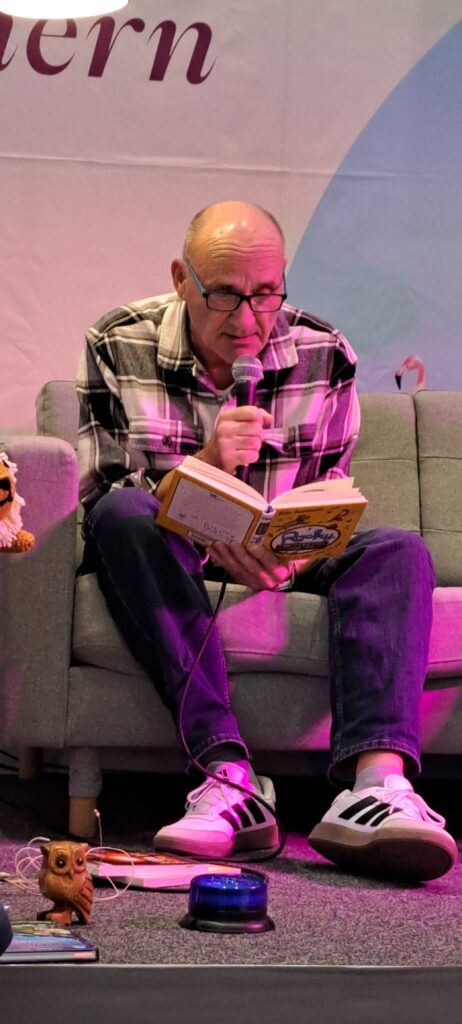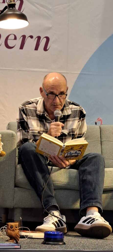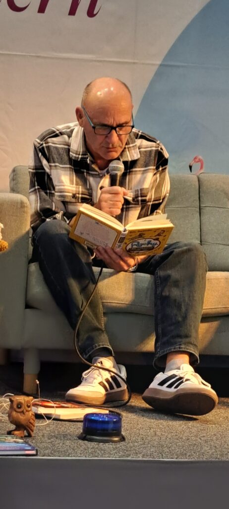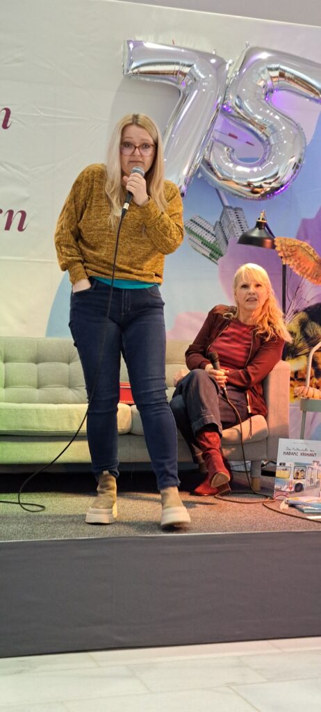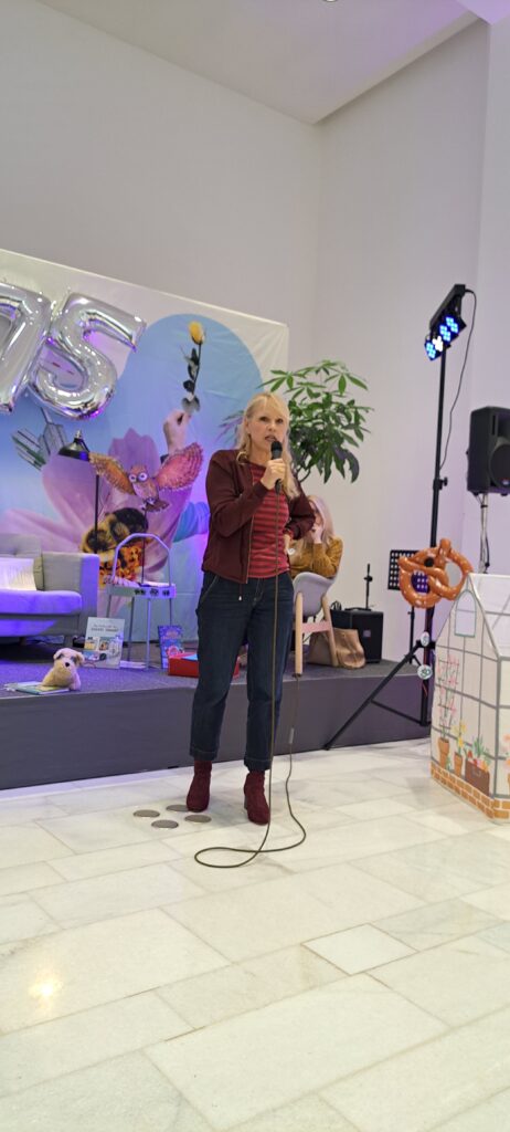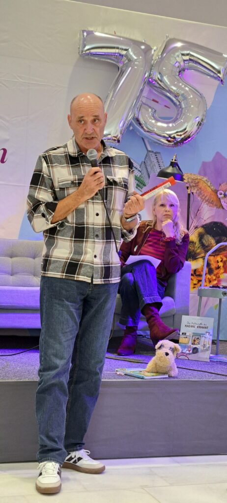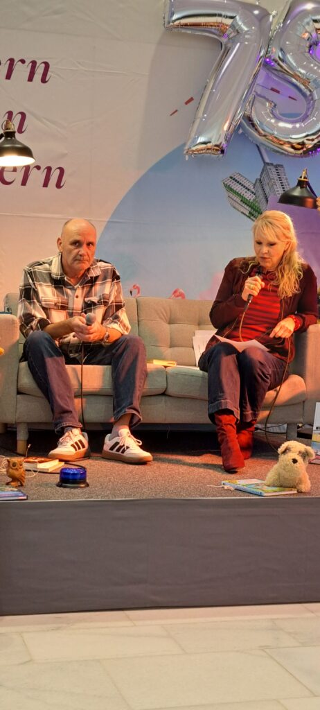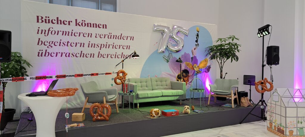 Sie möchten ihre Bekanntheit steigern. Möchten das viele Menschen von ihnen erfahren. Inzwischen sind es zwanzig Autorinnen, Autoren, Illustratorinnen und Illustratoren. Sechs sind heute da. Eine ist inkognito im Publikum. 😉