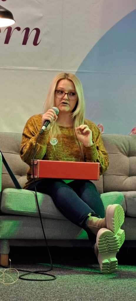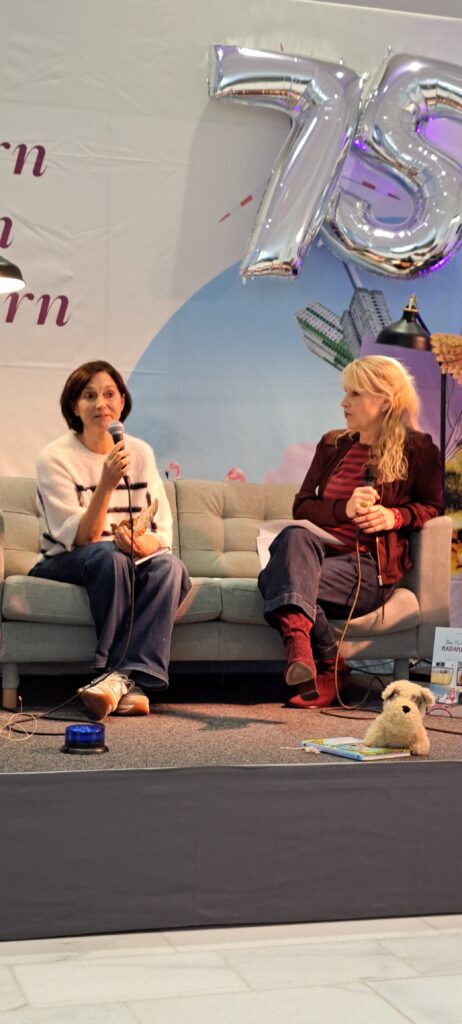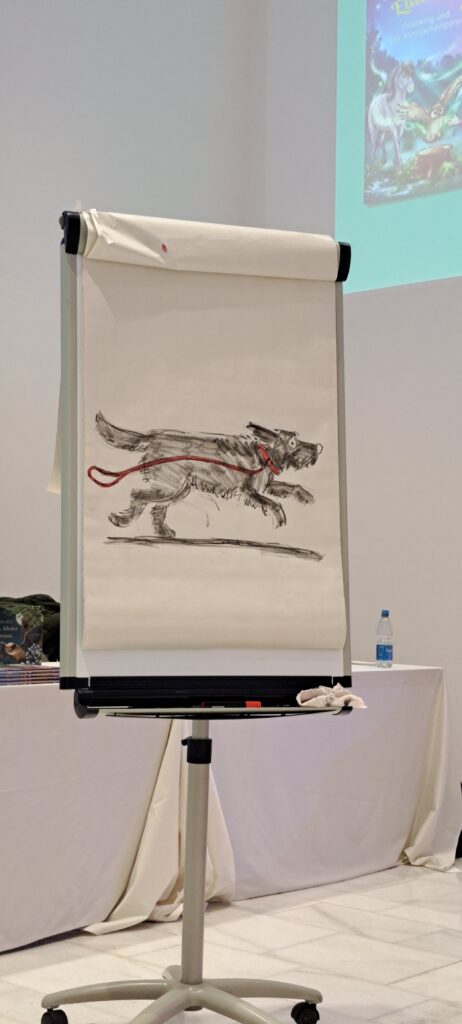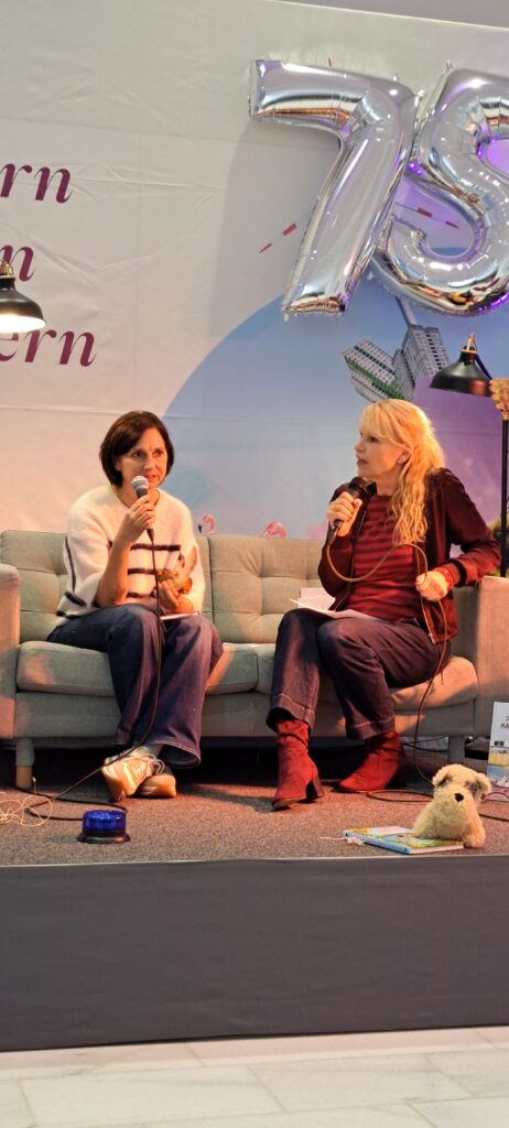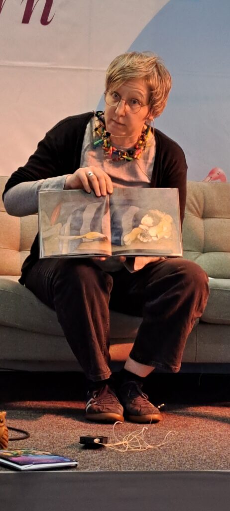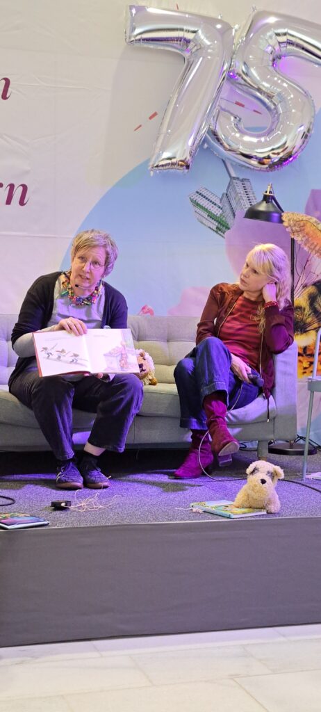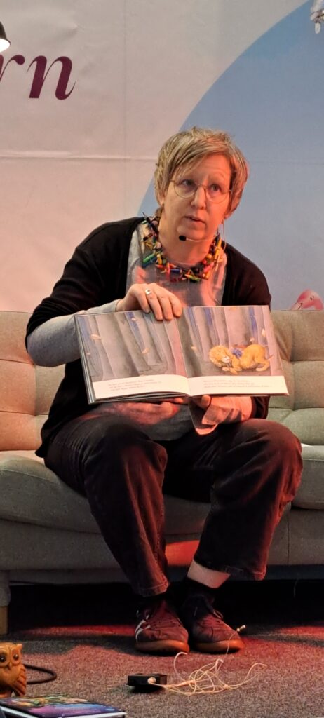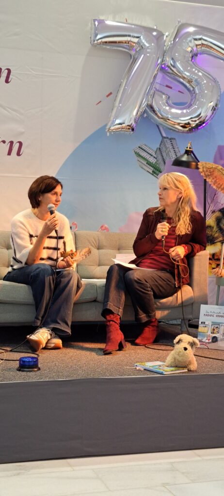 Sanne Dufft kommt aus Tübingen. Sie lebt dort mit ihrer Familie. Sie hat früh angefangen zu zeichnen. Mit SchülerInnen und LehrerInnen. Manche fanden es toll, manche nicht so. Sie hat Kunsttherapie studiert. Mit Kindern mit besonderen Bedürfnissen und Fähigkeiten in Nordirland gearbeitet. Ich dachte nur WOW! Irgendwann hat sie bemerkt, das sie nicht nur gut zeichnen, sondern auch gut erzählen kann. Ihr Buch Magnus und der Nachtlöwe, vereint beide kreative Adern. Der Nachtlöwe war sogar schon in New York, sagt Barbara. Sanne stimmt zu und erzählt, das sie 2018 einen internationalen Preis bekam. Woraufhin sie auf eine Schriftstellerkonferenz nach New York eingeladen wurde. Der Nachtlöwe war im Flugzeug dabei und hat sich auch New York angeschaut, berichtet sie weiter. War sicher spannend für den Löwen. New York ist doch soooo groß.