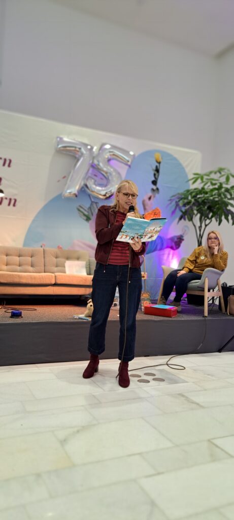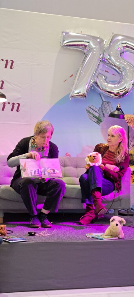 Barbara fragt die Kinder im Publikum: Geht es euch auch so? Sie nicken und sagen leise ja. Sanne erzählt weiter, das es ihren Kindern auch so ging. Sie hatten ihre Stofftiere, die sie beschützten. Bei ihrer Tochter war es der Bello. Bei Magnus, schenkt seine Oma ihm einen selbstgehäkelten Löwen. Mehr verrät sie aber noch nicht, denn sie will den Kindern das Buch zeigen und daraus lesen.