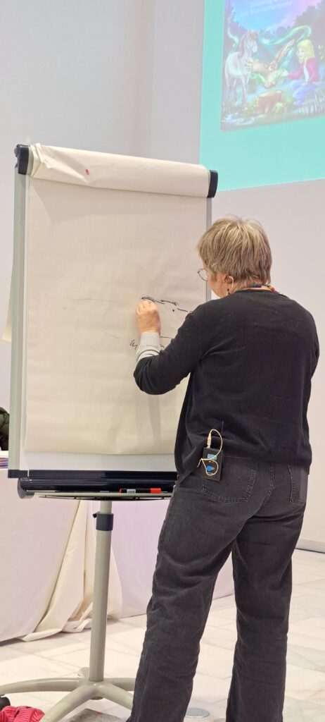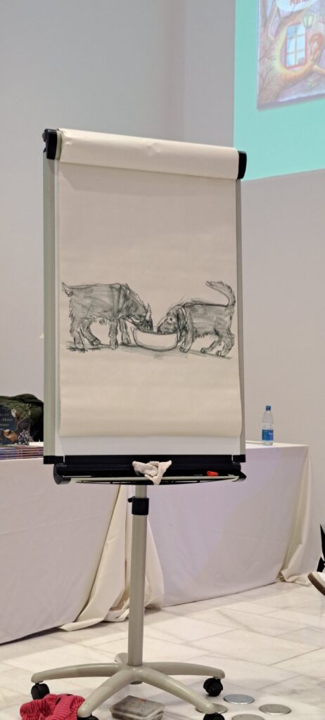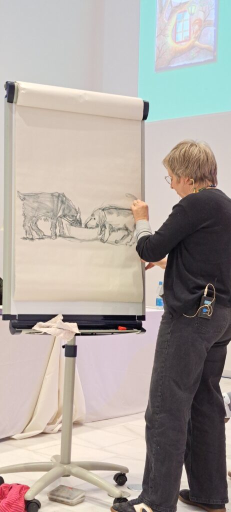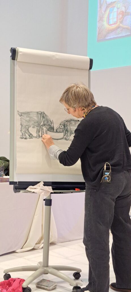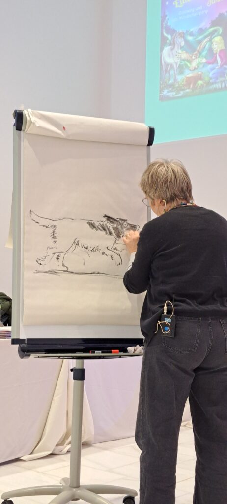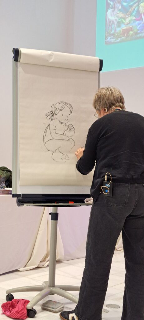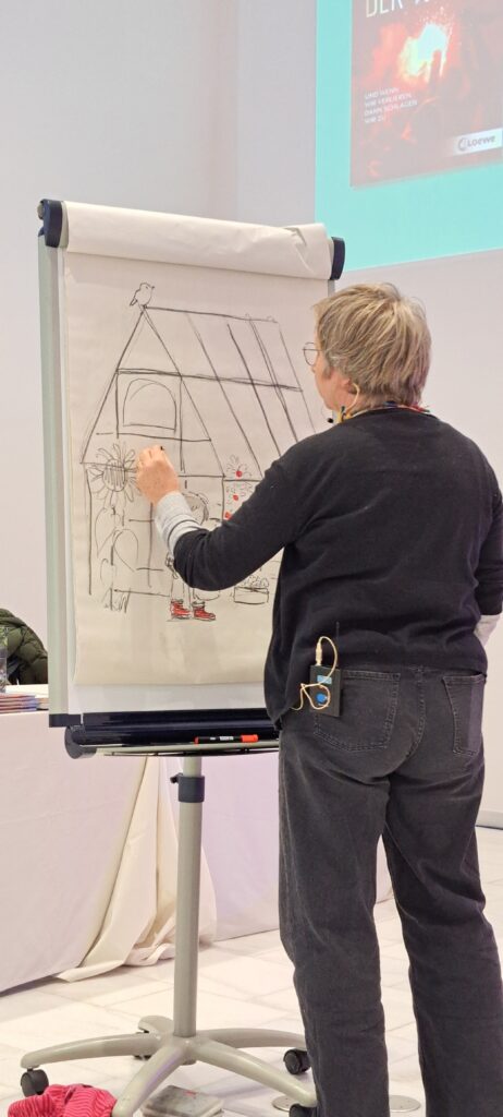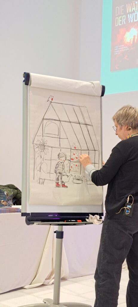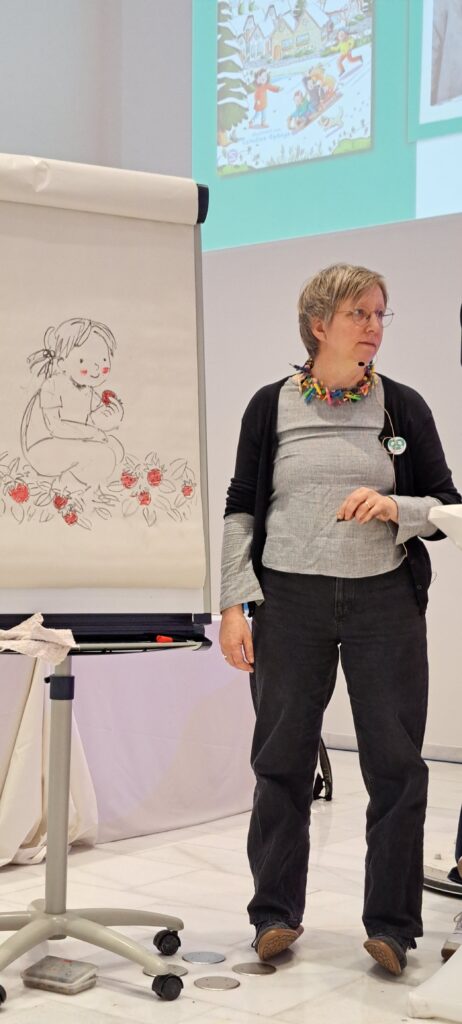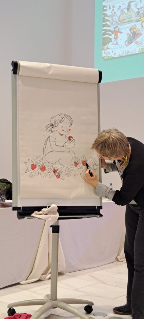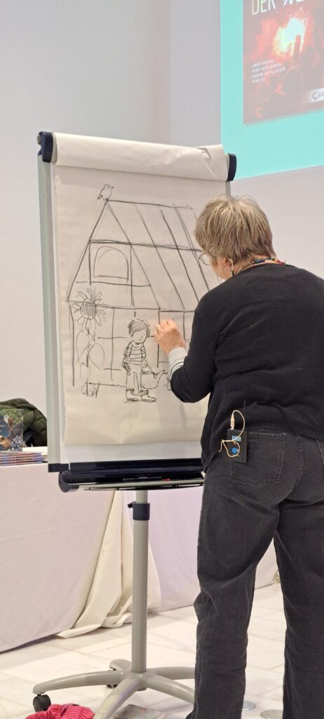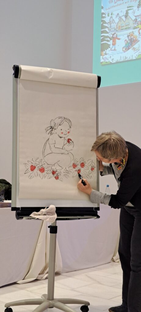 Sie kündigt Sanne an, die heute am meisten arbeiten muss. Sanne Dufft wird für die Kinder zeichnen. Diese bestimmen was gezeichnet wird. Ich finde schön, wie die Kinder miteingebunden werden.