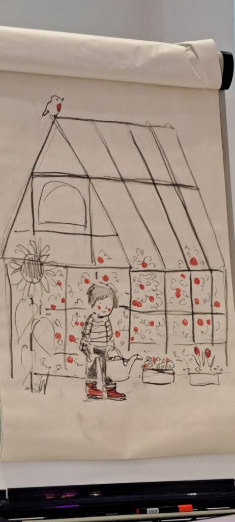 Nun ist Barbara Rose an der Reihe mit ihrer Geschichte. Vorher will sie aber wissen, was Sanne zeichnen soll. Ein Kind ruft das Erdbeerfeld….und schon macht sich Sanne an die Arbeit.