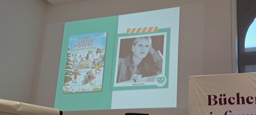 Die Kinder aus BirkbySchlittenfahrt mit Ziege heißt ihr Buch. Aus diesem Band liest uns Barbara Rose vor. Der Hund den sie als Stofftier dabei hat, ist der Pommes. Der heißt genauso wie die Pommes mit Mayonaise. Sie schreibt ganz viele Bücher, für Kinder und Jugendliche. Eine ist die Geschichte, der Kinder aus Birkby. Sie erzählt, wie sie auf die Geschichte gekommen ist und um was es geht. Es ist die Geschichte von vier Kindern. Sie sind Freunde Paul, Jette, Emilia und Benno. Emilia und Benno sind Geschwister. Sie finden einen Hund, der angebunden ist. Keiner kommt um ihn zu holen, so zieht er bei Paul ein. Sie gründen die Tierretterbande. Pommes gehört ab sofort auch dazu. Im Band 2 retten sie eine Ziege, die mitten auf einer Wiese steht. Sie nennen sie Tante Gertrud, weil sie meckert und sich anhört wie die Schwester von ihrem Papa. Zack hat sie den Namen weg. Als Paul laut lacht, lässt er aus Versehen die Leine von Pommes los. Die Ziege rennt vor Pommes weg. Direkt auf den Birkensee zu. Oh je… Doch sie stoppt. Nun jagt die Ziege Pommes. So geht das immer im Wechsel.