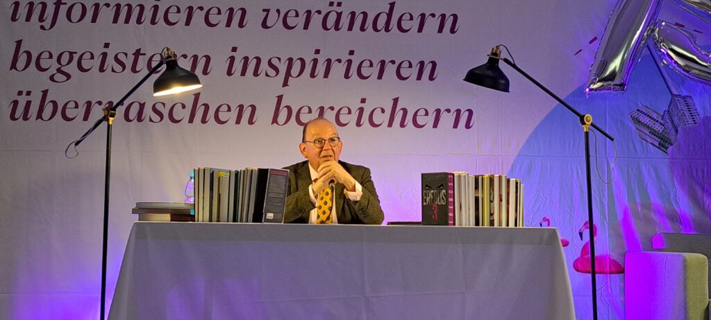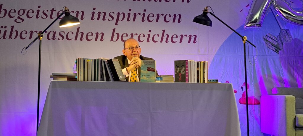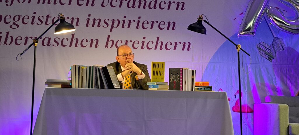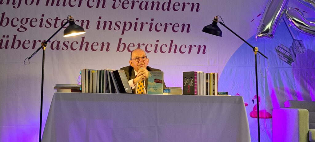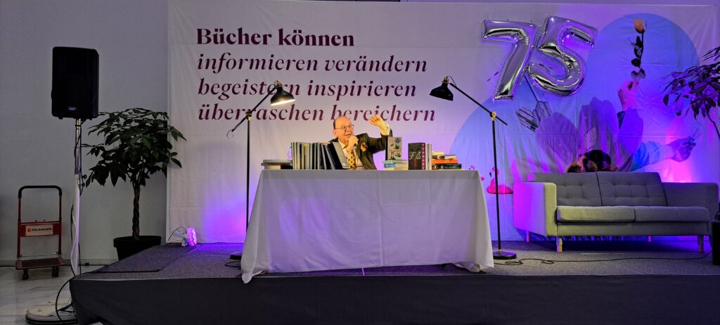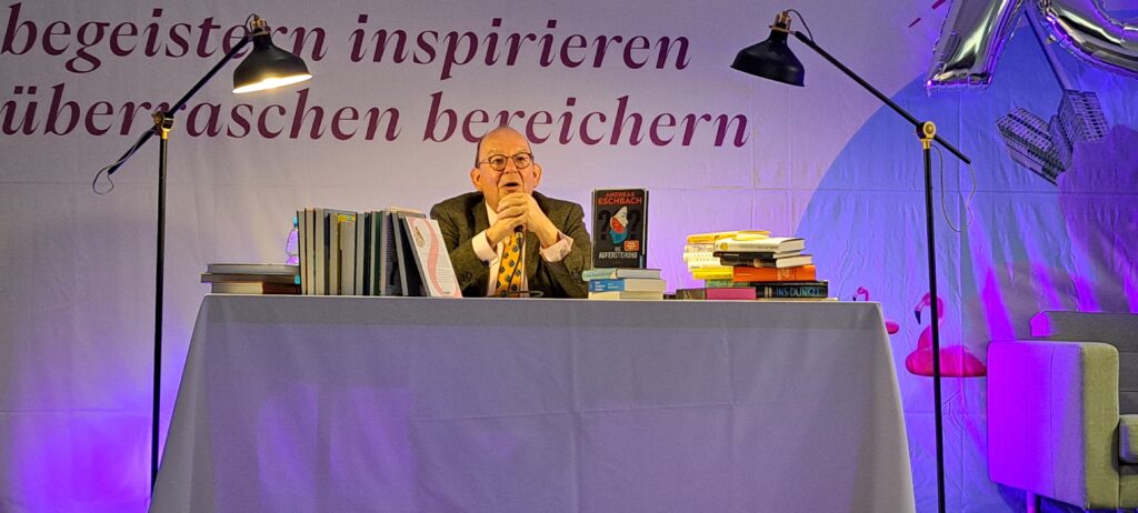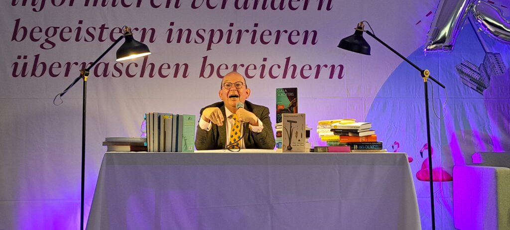 Er machte noch Veranstaltungstipps zu Anselm Grün. Berichtete aber auch das die Veranstaltung mit Denis Scheck und einige Tage später, mit Caroline Wahl ausgebucht waren.